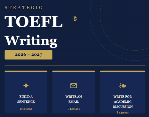Here Strategic TOEFL Advantage Students can find up to 8 simulated TOEFL Writing-like tests (Build a Sentence, Writing an Email, and Writing for an Academic Discussion). You access to these test can be purchased here. They are free to those students taking our course.